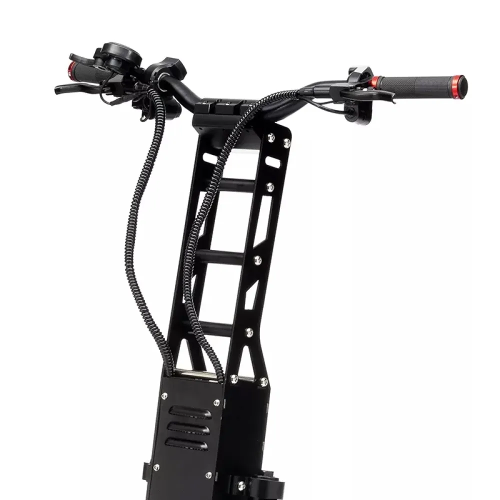 Комфорт и удобство пользования обеспечены широкой нескользящей платформой и удобной рулевой стойкой и прорезиненными грипсами. Качественная тормозная система и устойчивые накатистые колеса – дополнительные элементы безопасности эксплуатации техники. С точки зрения профи электросамокат создан для лидеров, смельчаков, целеустремленных личностей, не представляющих жизни без скорости и прилива адреналина. Брутальный дизайн подтверждает указанные факты.