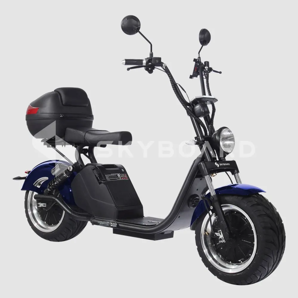 Электроскутер Citycoco Skyboard BR70-2WD Синий – небольшой стильный скутер с превосходными характеристиками. Он станет для вас надёжным транспортным средством для комфортной езды по любой дороге. Широкие 12-ти дюймовые колёса позволяют стабильно передвигаться как по гладкому дорожному полотну, так и по бездорожью. Эргономичное сиденье не даст вам устать даже в долгом путешествии. Мощный мотор может разогнать скутер до 59 км/ч, а однократного заряда батареи хватит на 40 км пути. Для перевозки вещей предусмотрено объёмное грузовое отделение позади сидения. Сам скутер, при весе в 98 кг, способен перевозить до 240 кг веса. Безопасность обеспечивают крайне надёжные тормоза, удобные зеркала заднего вида, а в ночное время суток к ним присоединяются стоп-сигнал на заднем крыле и яркая лампа спереди.