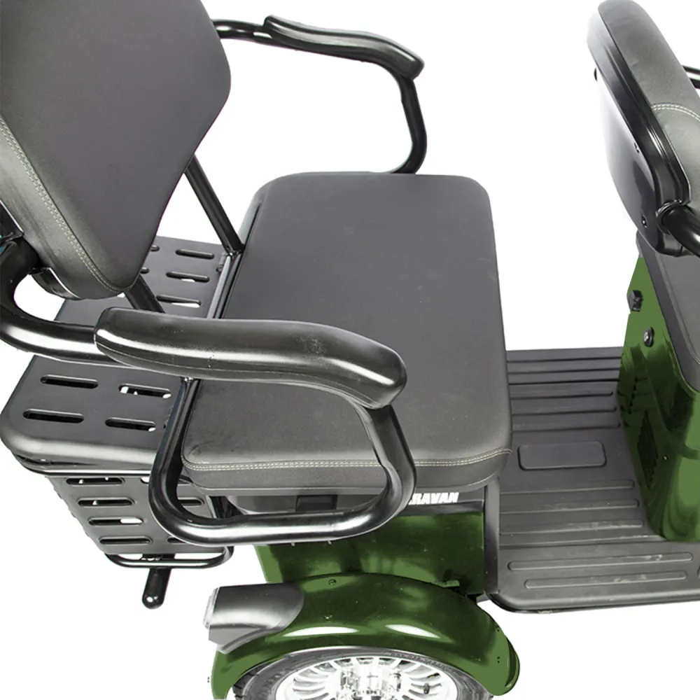 Трицикл Rutrike Караван зеленый – серьезная вместительная техника для туристического бизнеса и семейных пар. Оснащена пассажирским и водительским вместительным сиденьем, не стесняющим в движениях, обеспечивающих удобство передвижения.