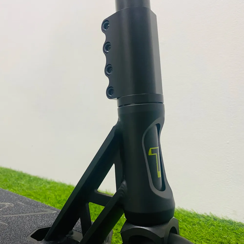Широкая алюминиевая дека стала намного удобнее для езды за счет своего размера 14*56*41 см.  Классическими остались и заваренные скошенная передняя ее сторона и квадратная задняя. Новинкой в этой модели является фендер, который защищает самокат от непреднамеренного торможения. Привычный стальной тормоз тоже не стали убирать. Алюминиевая фрезерованная вилка соединяется с высоким рулем системой SCS-компрессии  с четырех болтовым зажимом на болтах-"шестерках”. Вращения колес обеспечивает подшипник ABEC 9 Chrome. А сами колеса выполнены из полиуретана с дисками из алюминия.